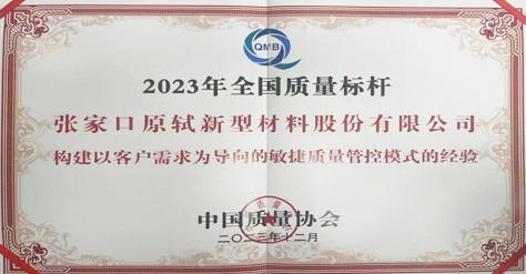 2023年12月,張家口原軾新型材料股份有限公司憑借 “構(gòu)建以客戶需求為導(dǎo)向的敏捷質(zhì)量管控模式的經(jīng)驗(yàn)”,榮獲2023年全國質(zhì)量標(biāo)桿企業(yè)。